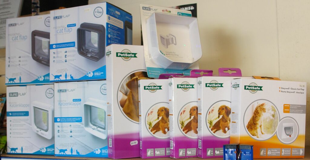 We have various cat flaps and pet doors. As well as some very cheap options, we stock the SureFlap range. SureFlap pet doors are available in white or brown, and come in two sizes. These doors register to your cat’s microchip, and work with up to 32 cats. The basic SureFlap controls which cats can enter your house. The DualScan also controls which cats can exit your house, and you can assign individual permissions.